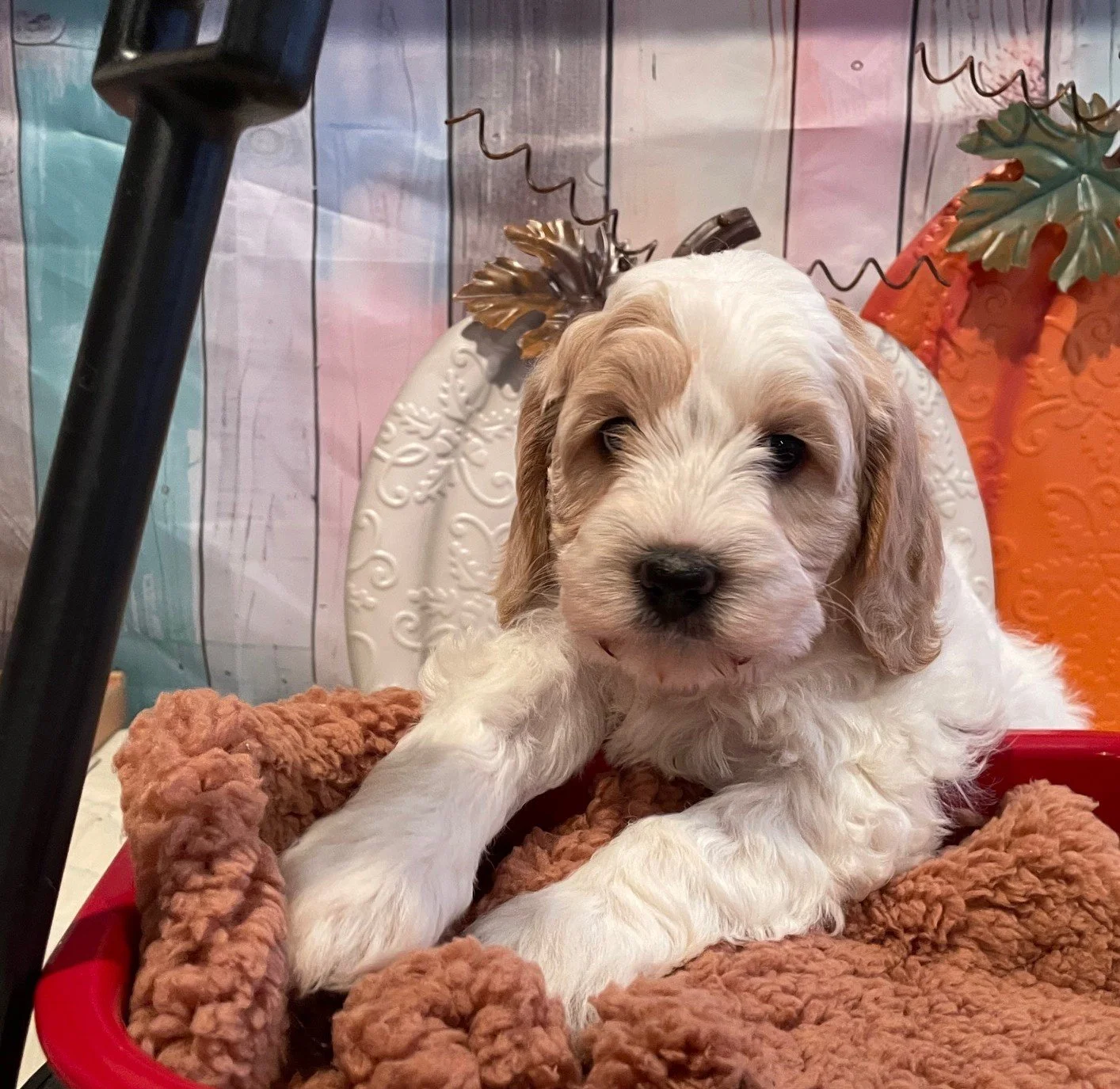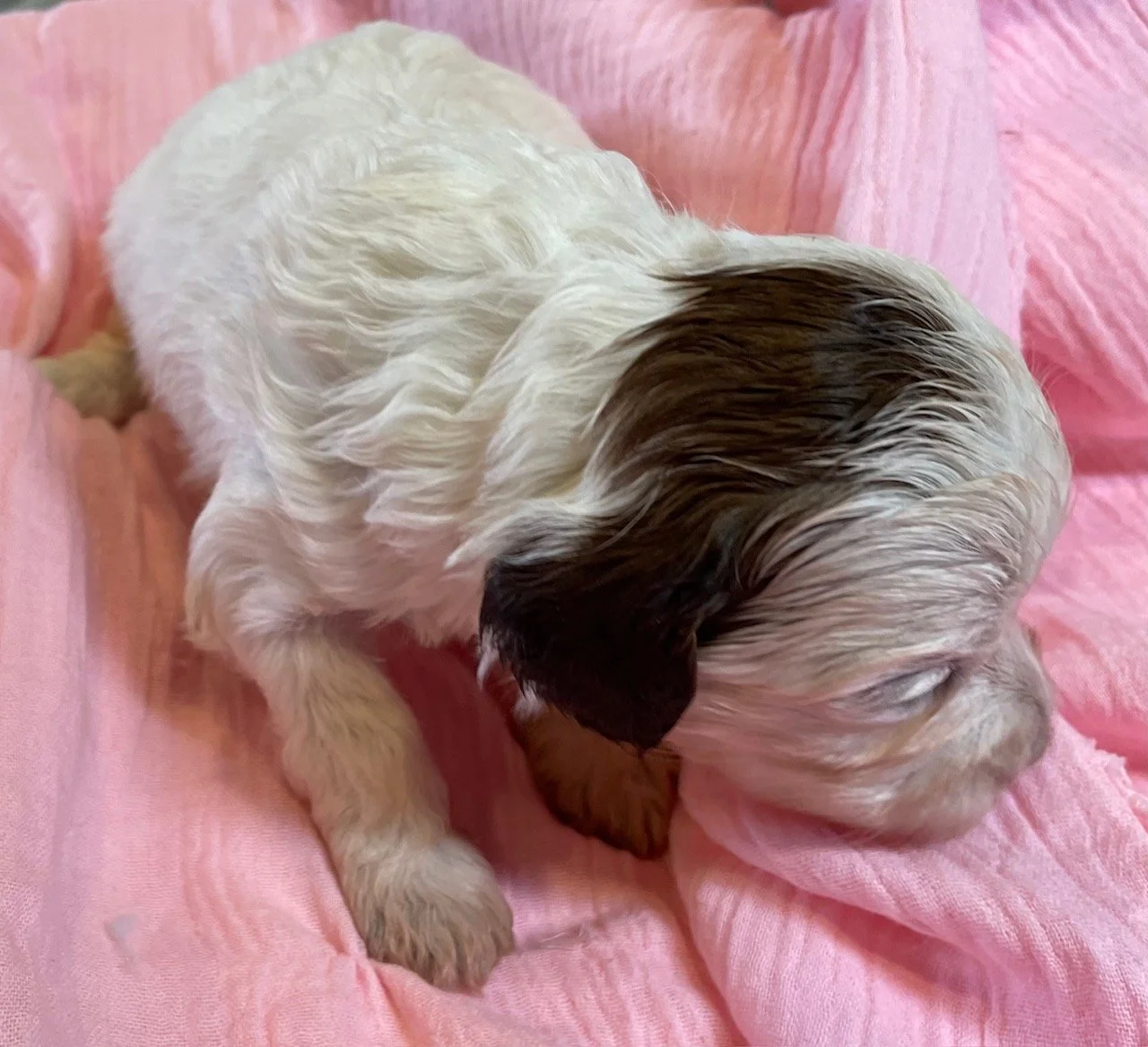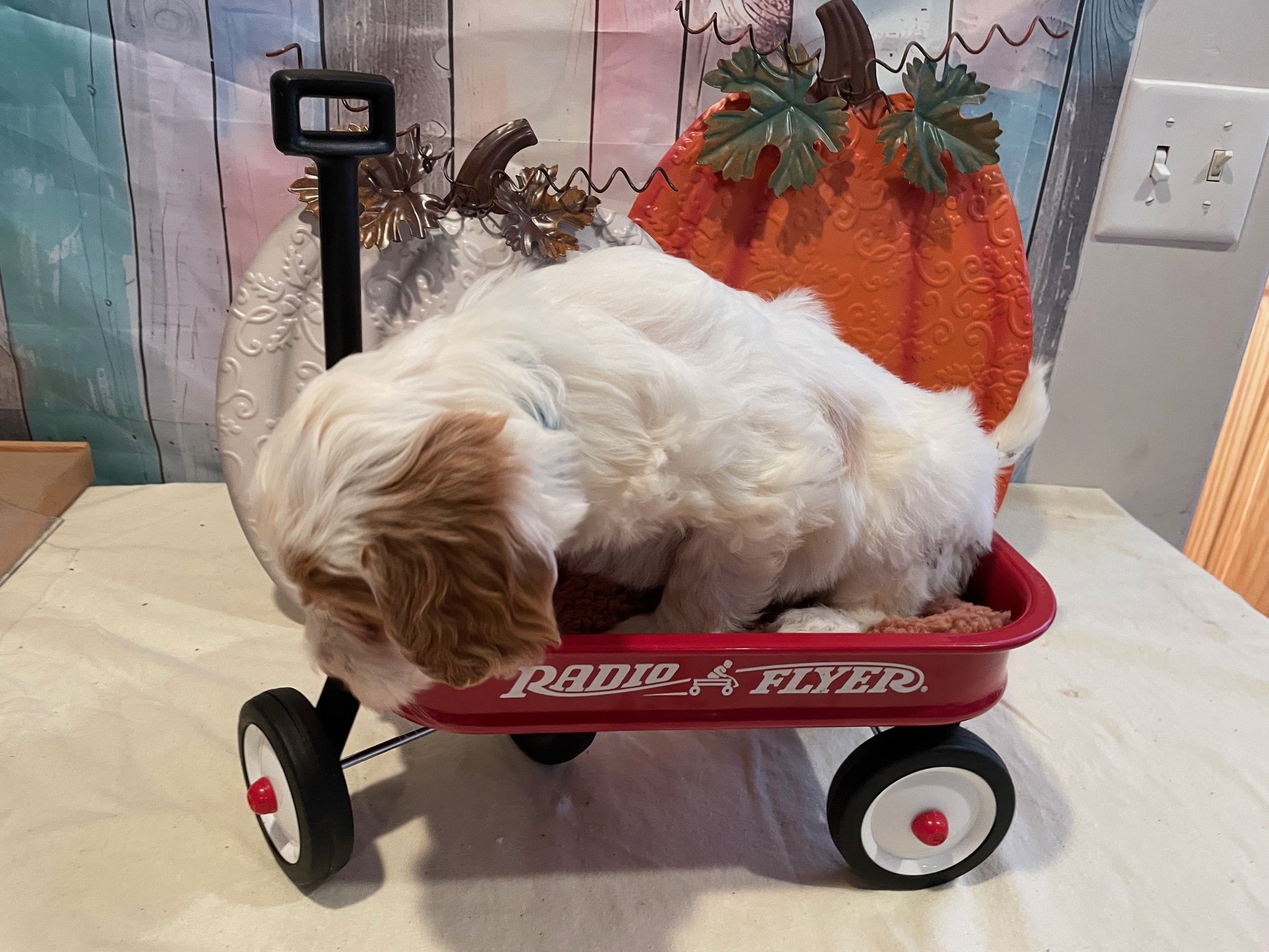 Jason, Jason is our only boy with the Parti coat, which means he may have a Roan coat. He is our silliest puppy, he loves to perform for his litter mates.