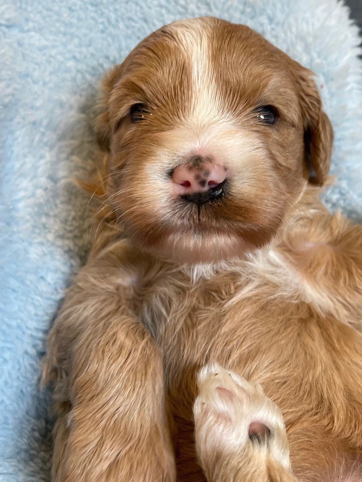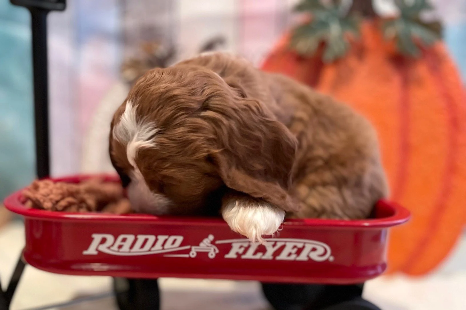 This sweet litter was born on September 30th, 2025, and will be ready to meet their new best friend(s) around Thanksgiving. These puppies belong to Bayleigh a medium Size, Extreme Parti White and tan multigenerational Labradoodle. Their father is Carter a stunning Mini, Red Tuxedo, Multigenerational Labradoodle, he has a fleece coat highlighted with white.