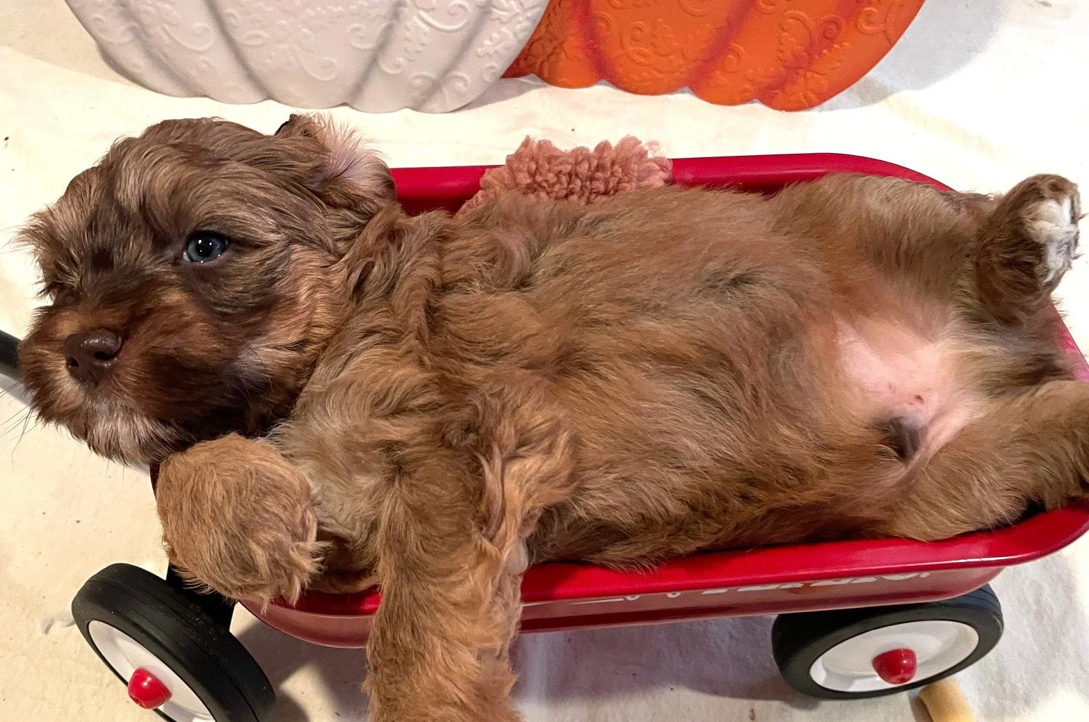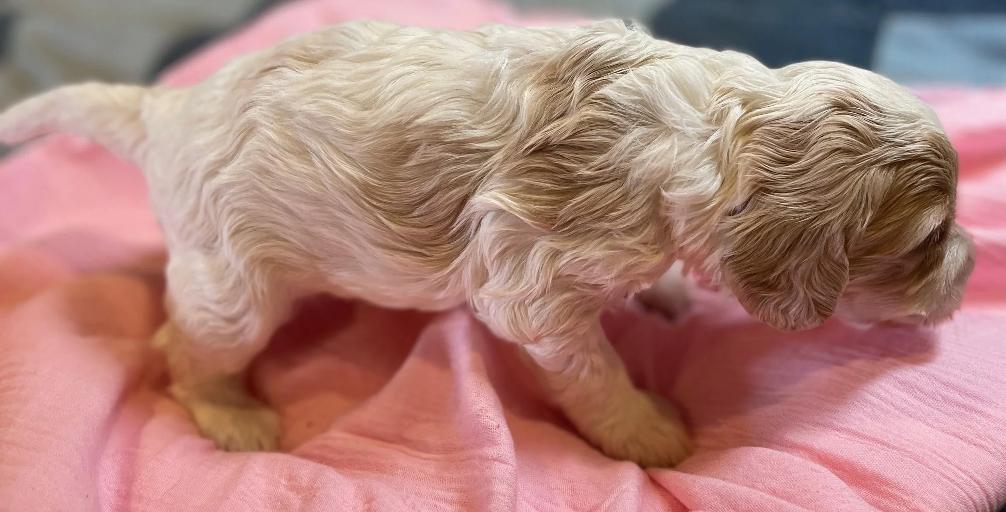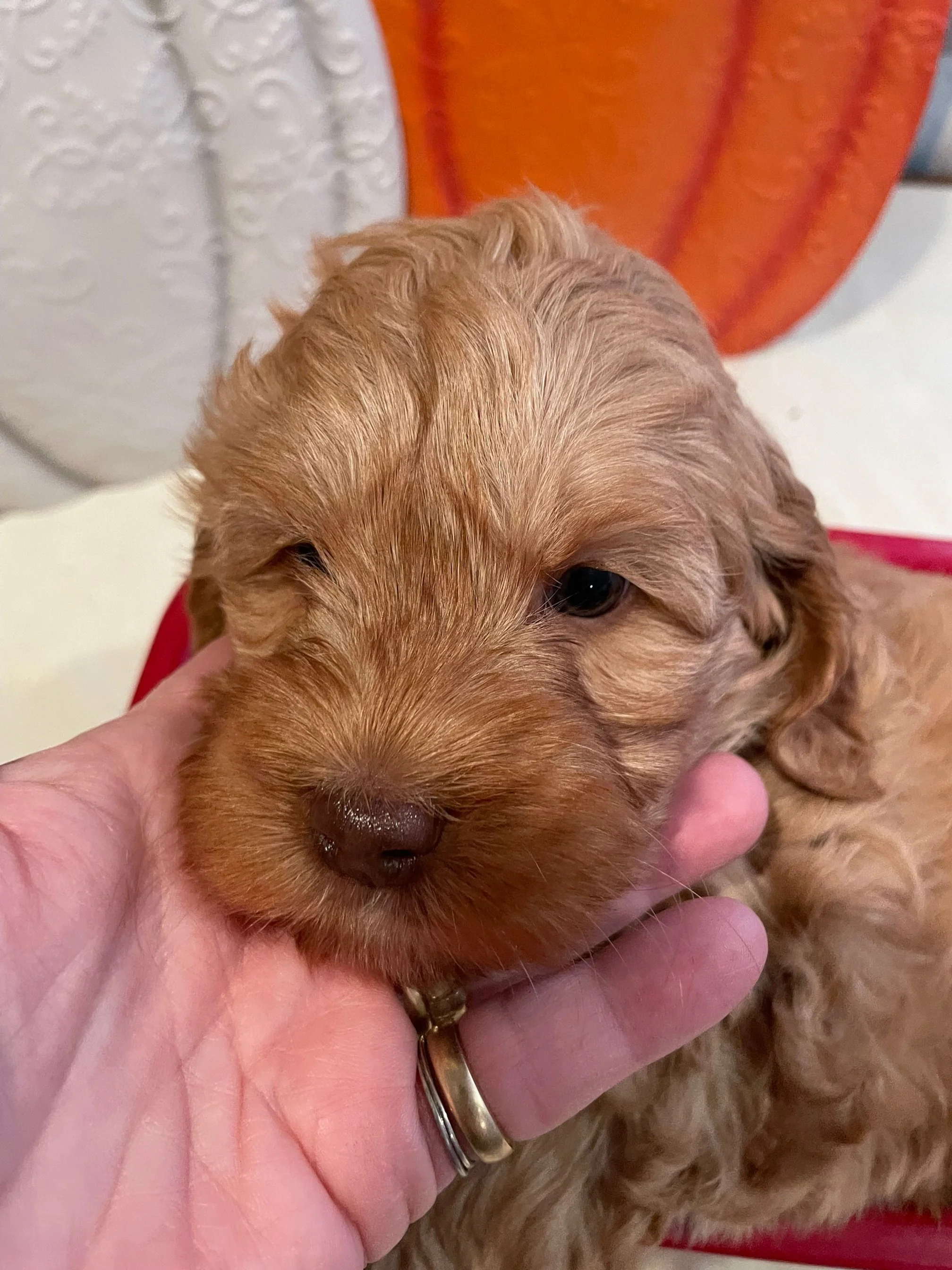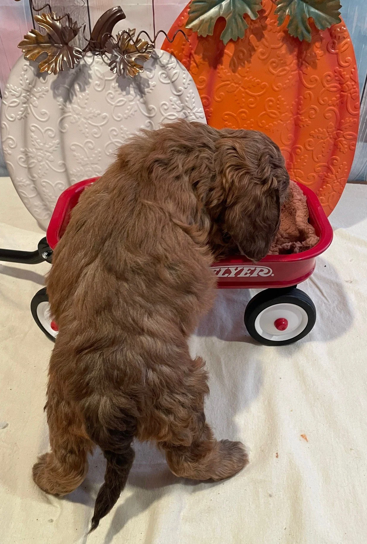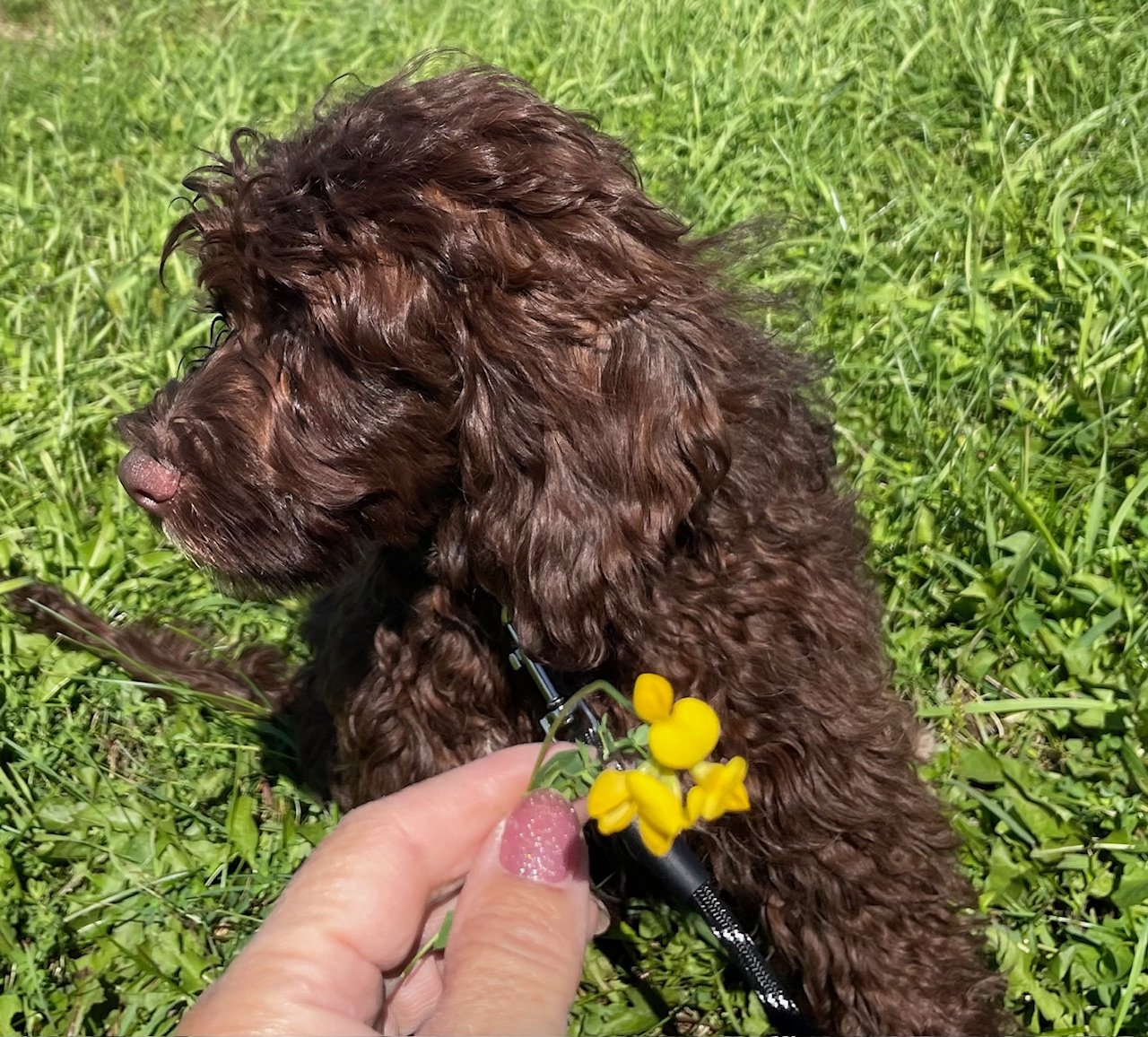 Iris This darling girl has a high probability of having a Roan coat, she is a mini Labradoodle like her daddy, she is calm and sweet.