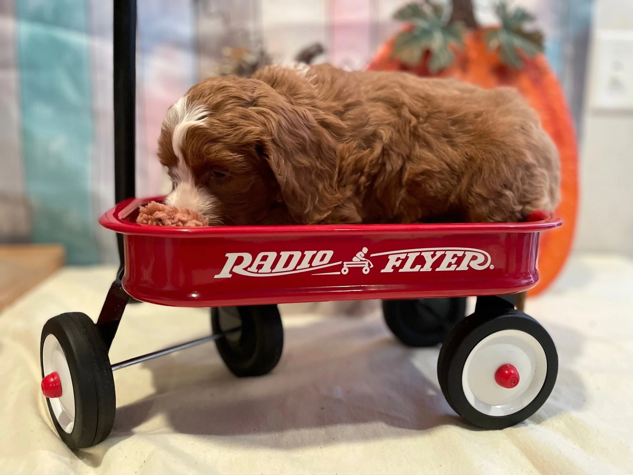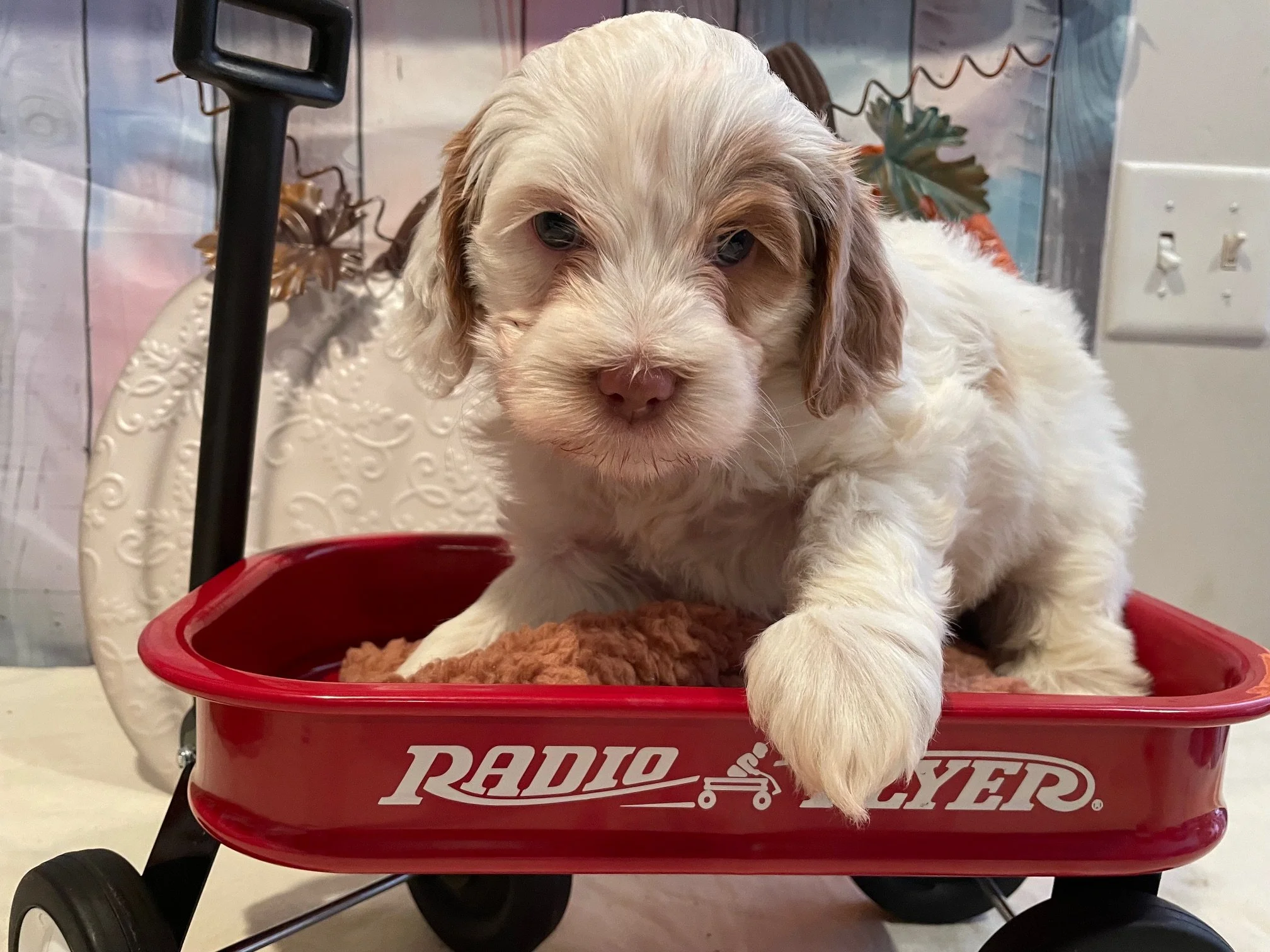 Our daddy, Carter carries the Roan gene. The Roan gene affects dogs with the Parti coat (White with colored spots.) Roaning takes from 6 -12 months to show up in pups, and will cause a speckling or mottled appearance. This mottling can show up anywhere the pup has white fur, and will typically be the same color as their darker spots. Any of our Parti puppies may express the Roan Gene, which can make the coat of the doodles stunning.